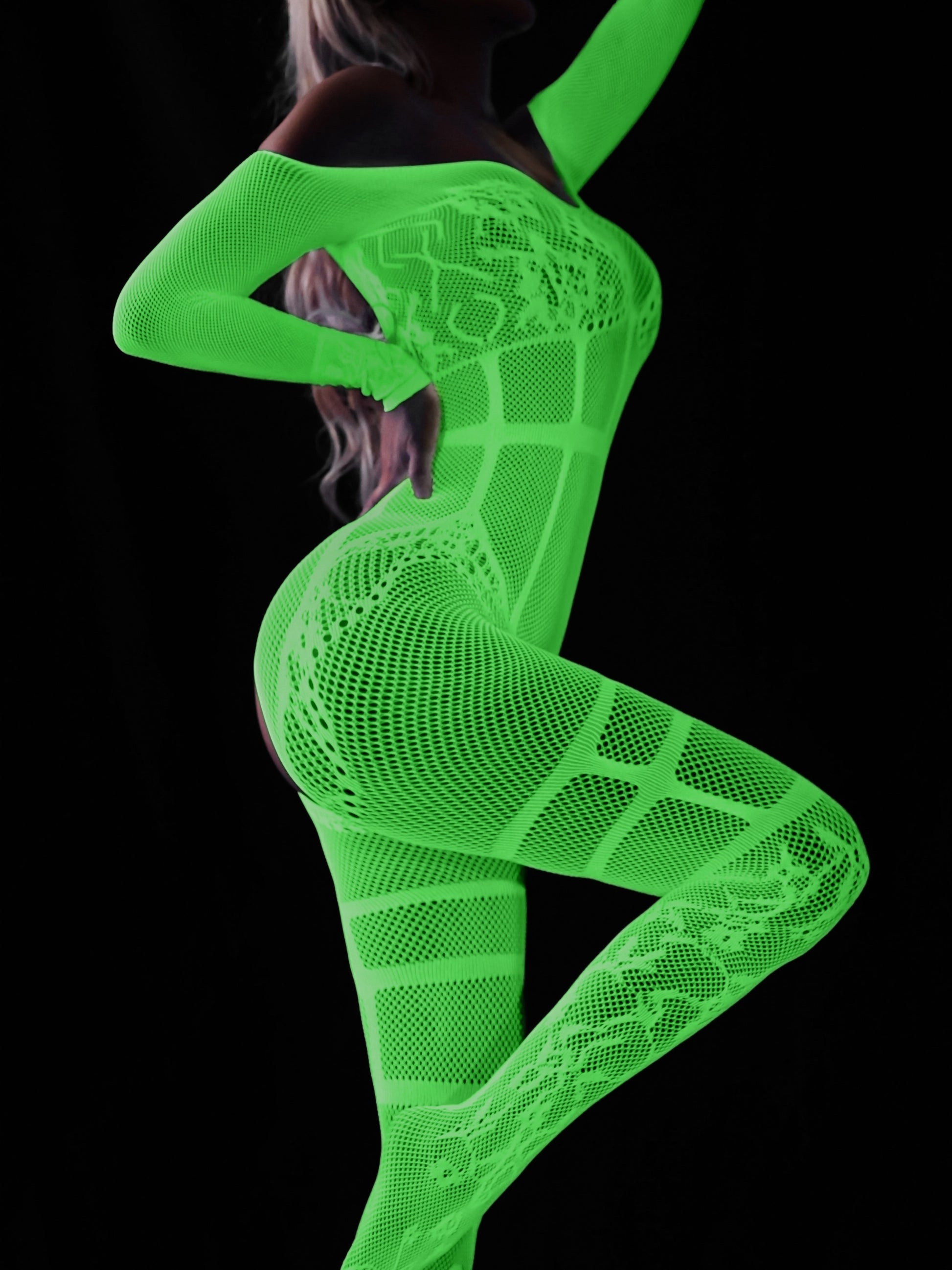 Plus Size Womens Seductive Bodystocking - High Stretch, Strapless, Off Shoulder, Crotchless, Luminous Fishnet Pattern, Polyester Knit Fabric Full Body Stocking for Adult