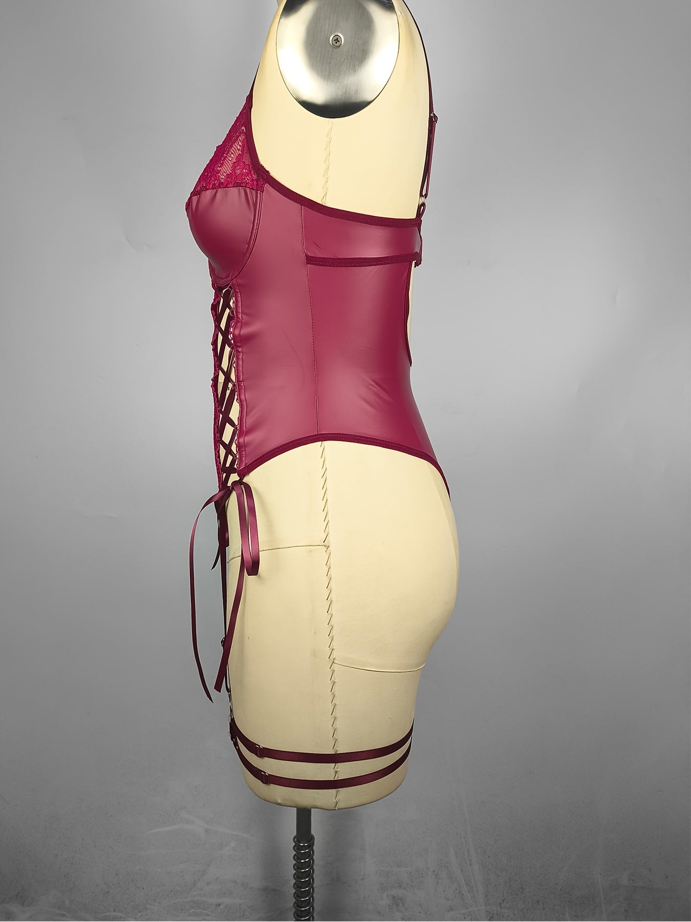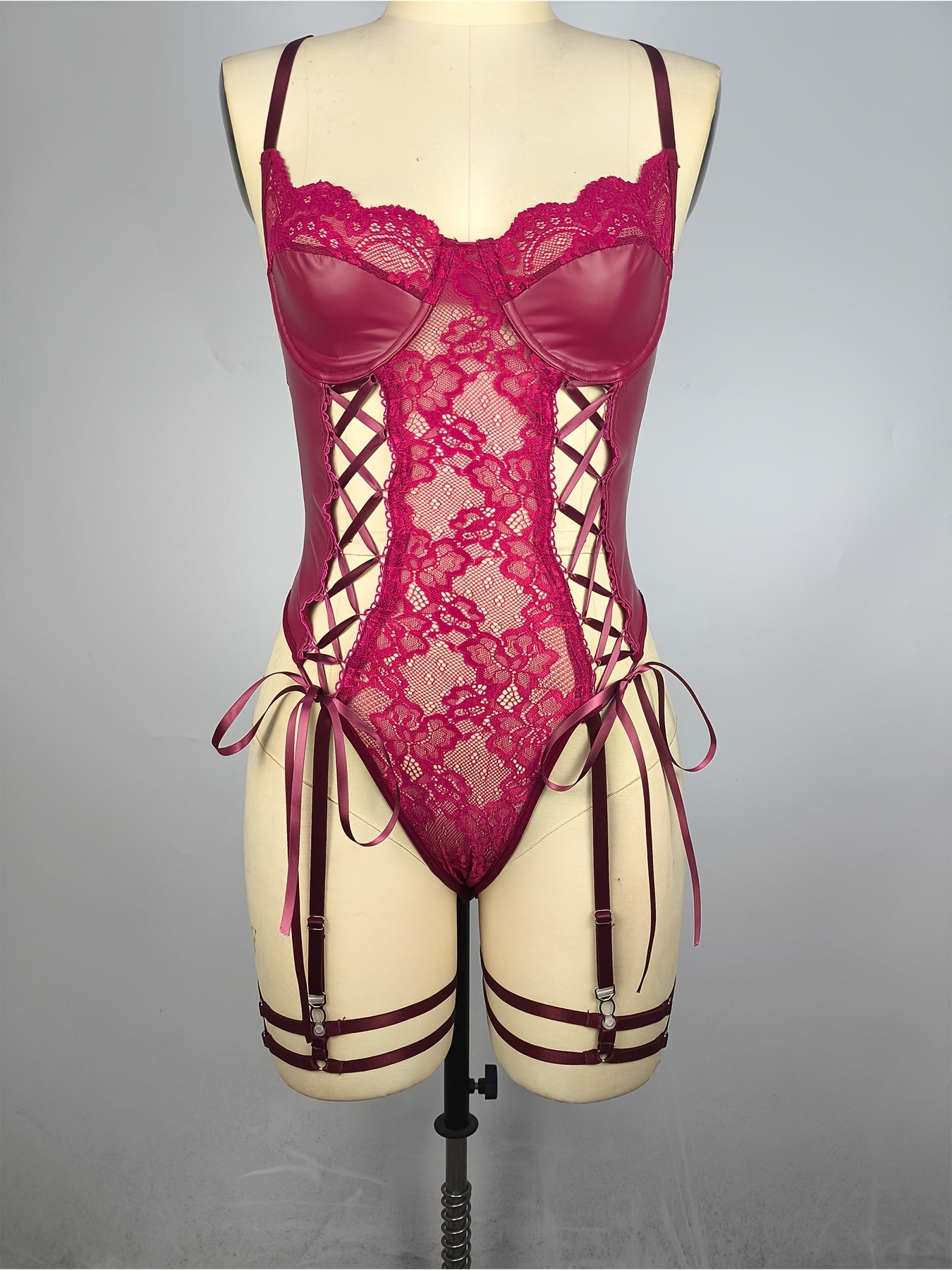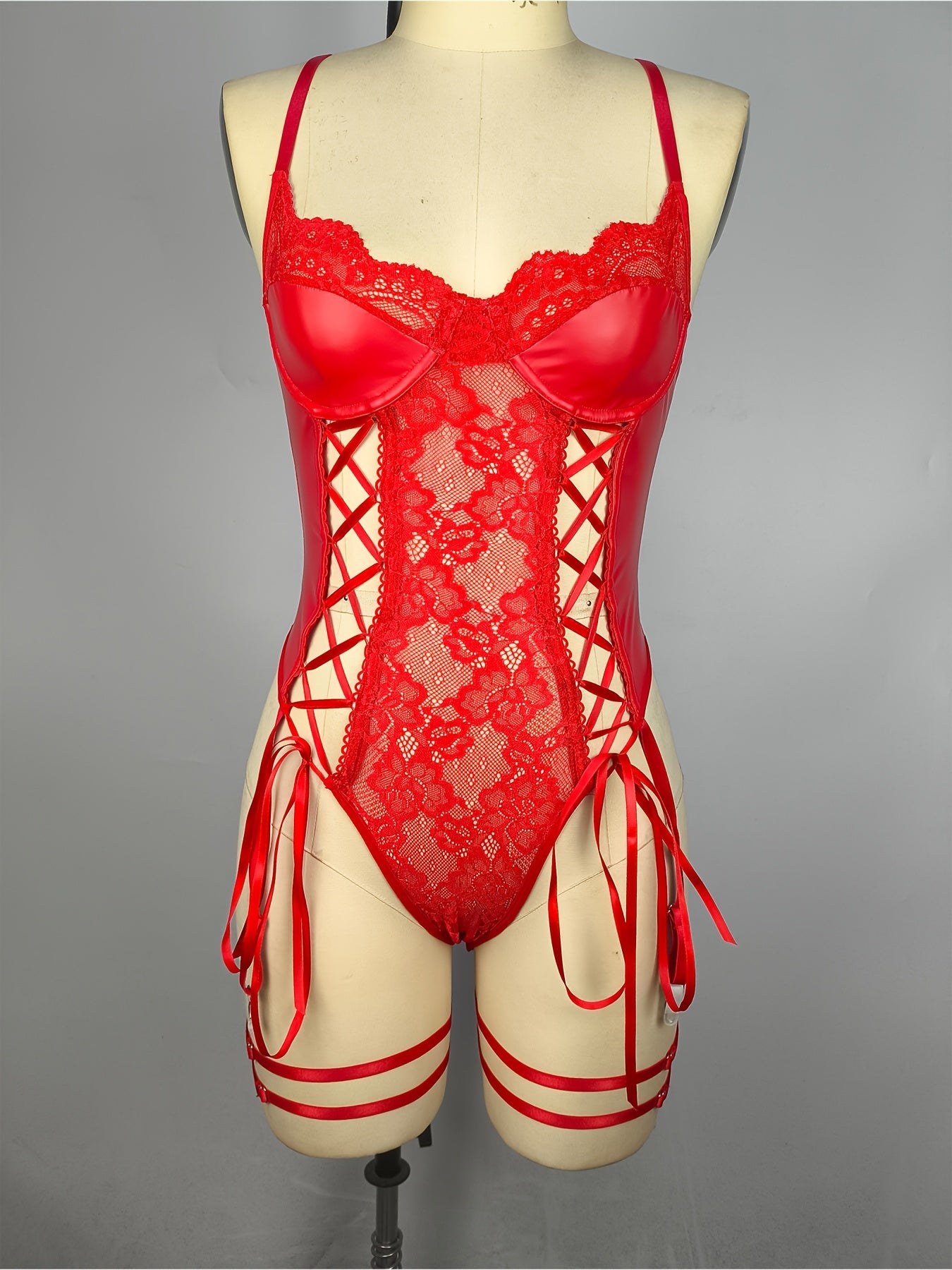 Sultry PU Leather Bodysuit - Contrast Lace, Semi-Sheer, Micro Elasticity, Plunging Backless Design, Lace-Up Garter Belt, Sexy Lingerie for Women - Knit Fabric, Solid Color, Bodystocking Stocking