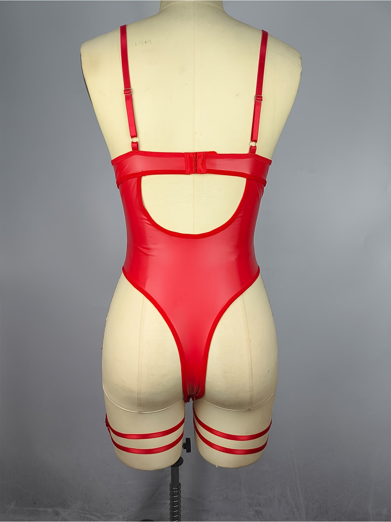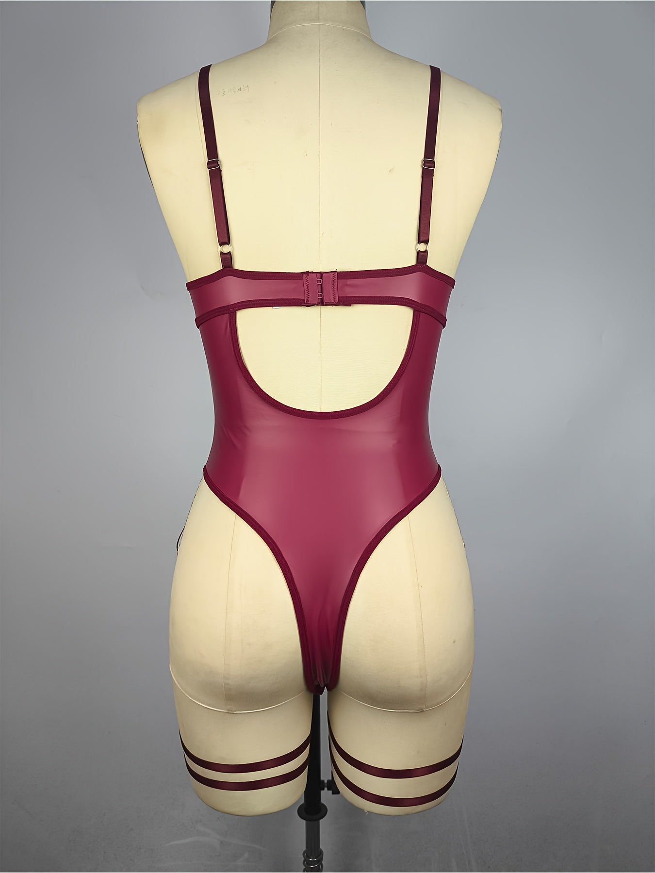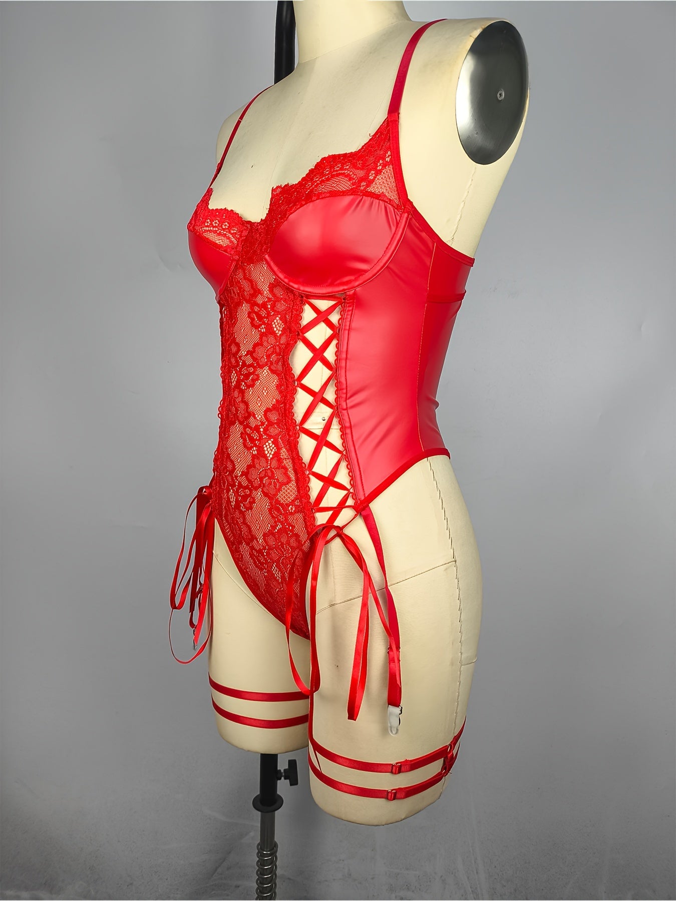 Sultry PU Leather Bodysuit - Contrast Lace, Semi-Sheer, Micro Elasticity, Plunging Backless Design, Lace-Up Garter Belt, Sexy Lingerie for Women - Knit Fabric, Solid Color, Bodystocking Stocking